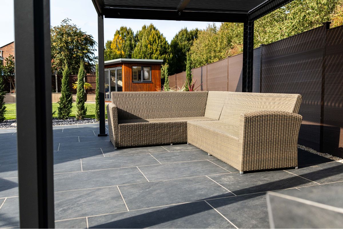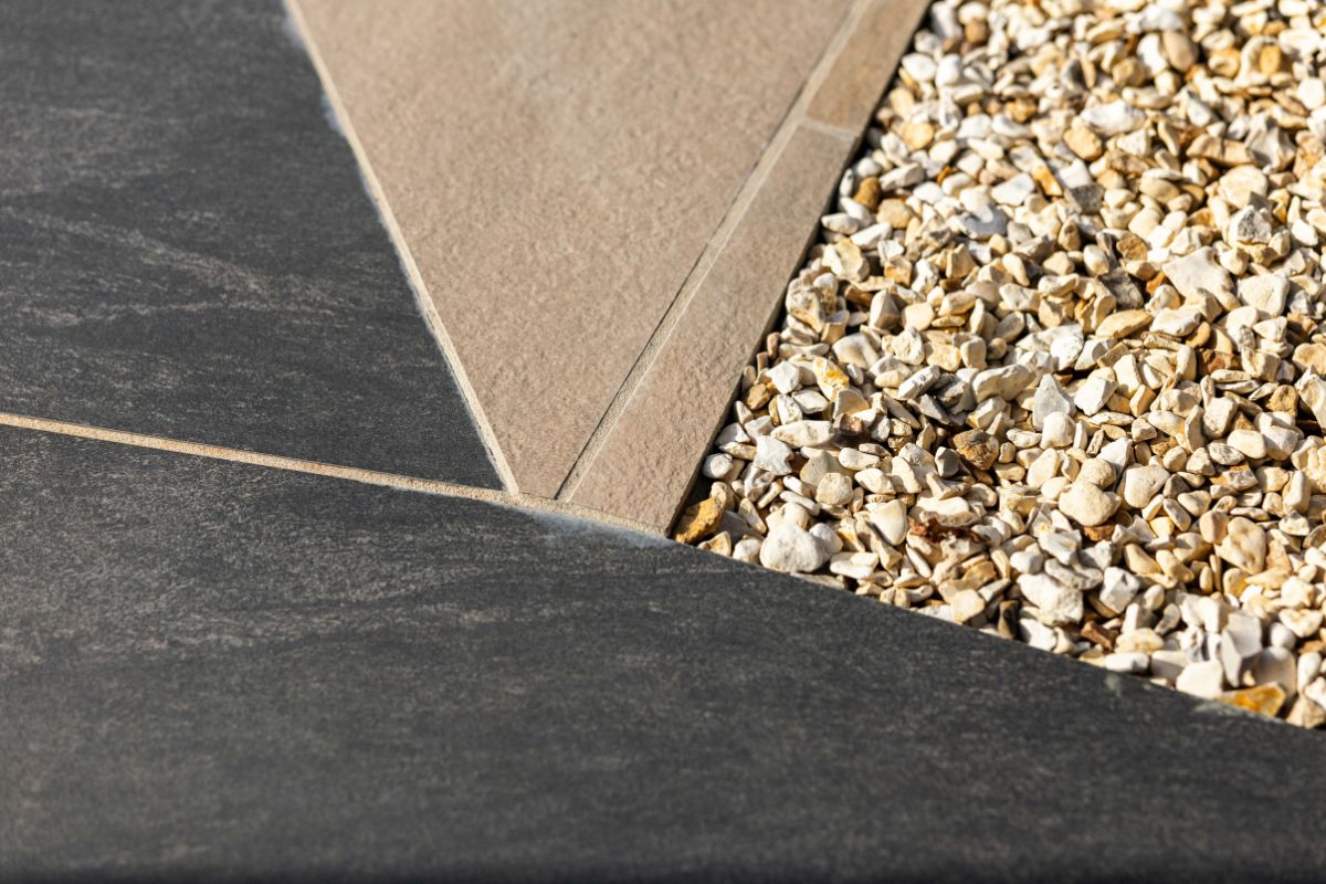 - Eden Spring Blend porcelain paving was chosen to complement the property’s existing natural sandstone patio, which was retained in place.