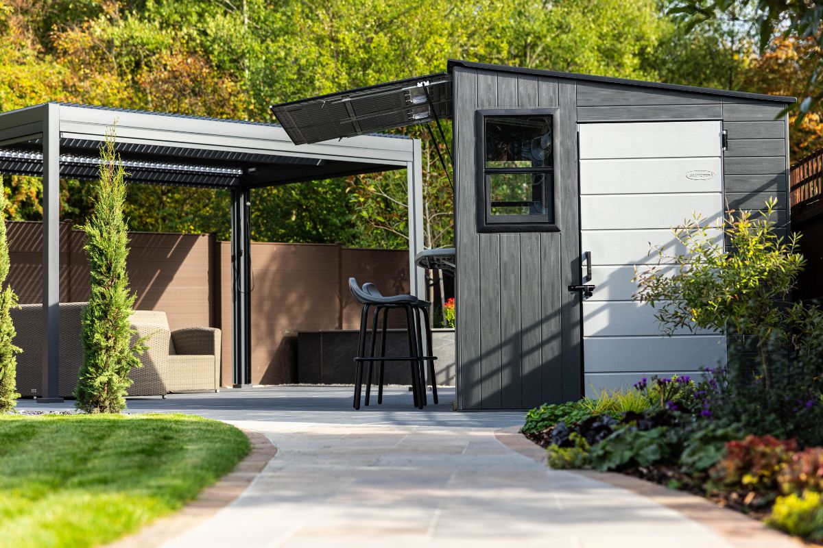 - A pergola with a louvred roof, offering adjustable shade and weather protection for year-round usability.